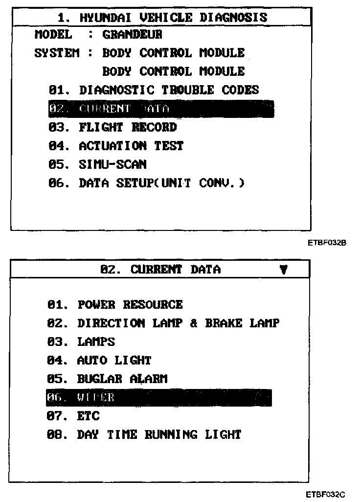 4. Select "Current data" and wiper.
