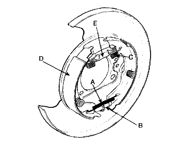 6. Remove the upper return spring (C) and the brake shoes (D).