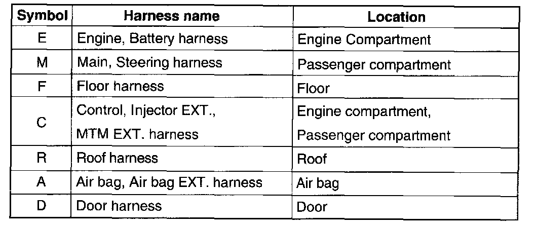 - It depends on vehicles, it is necessary to check the harness name symbol on the harness layouts for detailed symbol.