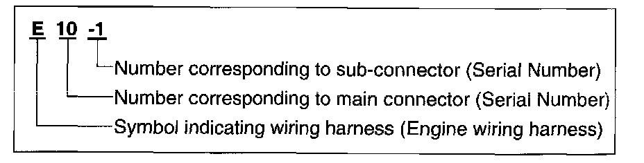 A connector identification symbol consists of a wiring harness location classification symbol corresponding to a wiring harness location and number corresponding to the connector.