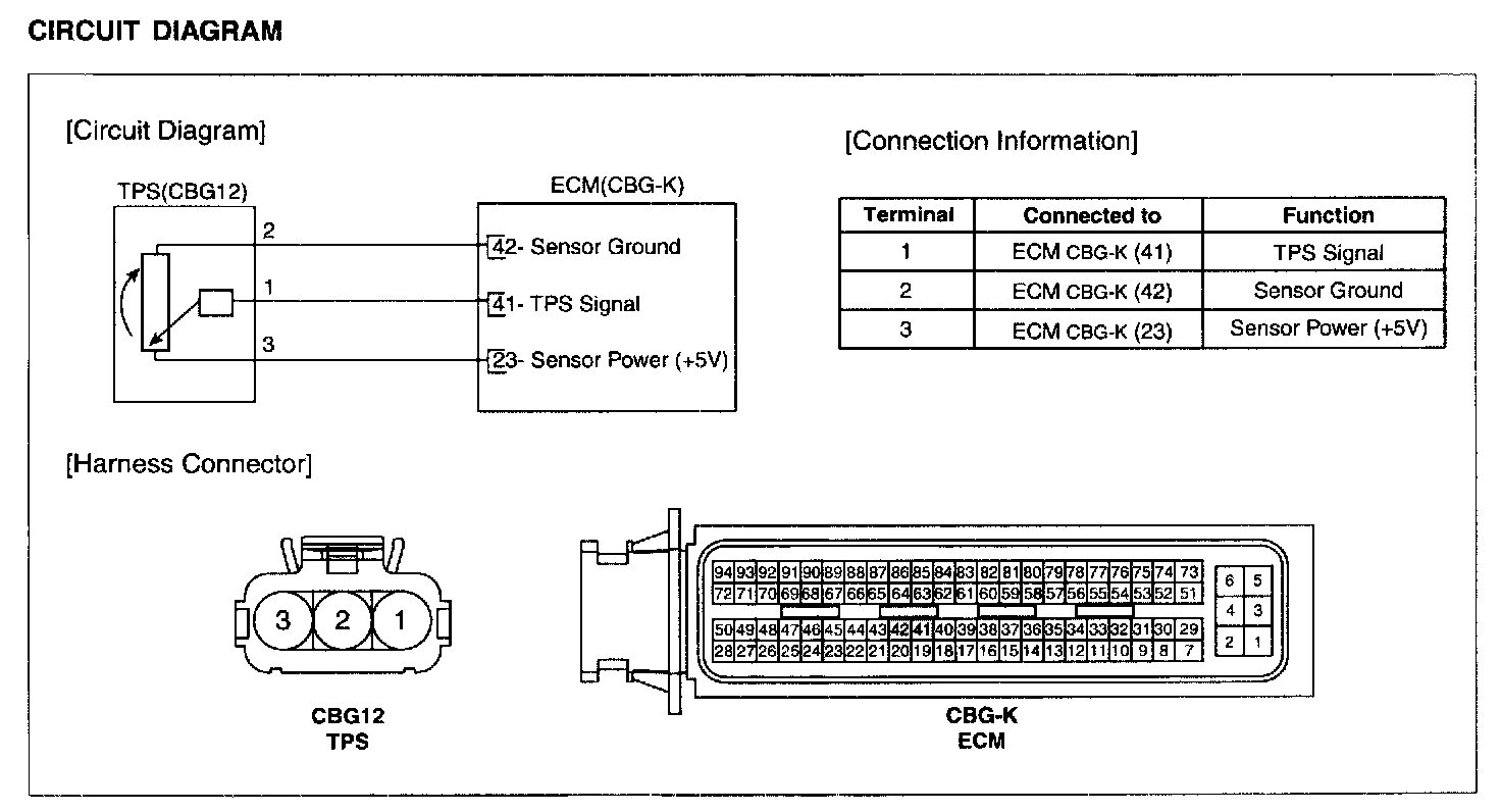 The Throttle Position Sensor (TPS) is mounted on the throttle body and detects the opening angle of the throttle plate. The TPS has a variable resistor (potentiometer) whose characteristic is the resistance changing according to the throttle angle. During acceleration, the TPS resistance between the reference 5 V and the signal terminal decreases and output voltage increases; during deceleration, the TPS resistance increases and TPS output voltage decreases. The ECM supplies a reference 5 V to the TPS and the output voltage increases directly with the opening of the throttle valve. The TPS output voltage will vary from 0.2 - 0.8 V at closed throttle to 4.3 - 4.8 V at wide-open throttle. The ECM determines operating conditions such as idle (closed throttle), part load, acceleration/deceleration, and wide-open throttle from the TPS. Also The ECM uses the Manifold Absolute Pressure Sensor (MAPS) signal along with the TPS signal to adjust fuel injection duration and ignition timing.