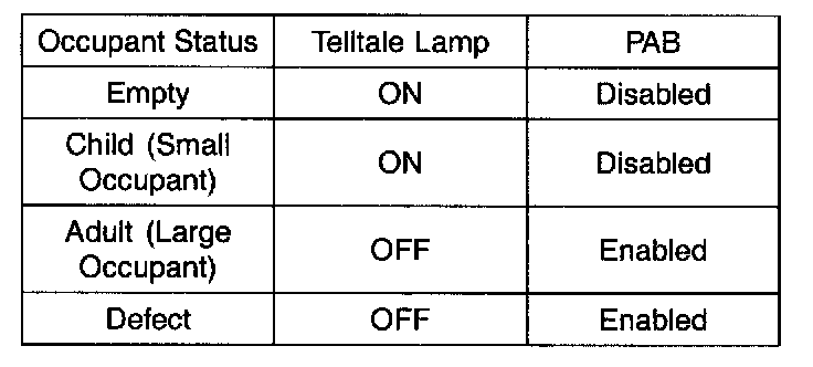 The Telltale Lamp indicates the Passenger Airbag (PAB) enabled and disabled status based on occupant status of passenger seat. If the passenger seat is empty or occupied with child (or child seat), the Passenger Airbag is disabled and the Telltale Lamp is turned ON to inform the driver that the PAB is disabled. As soon as operating voltage is applied to the SRSCM ignition input, the SRSCM activates telltale lamp prove out.