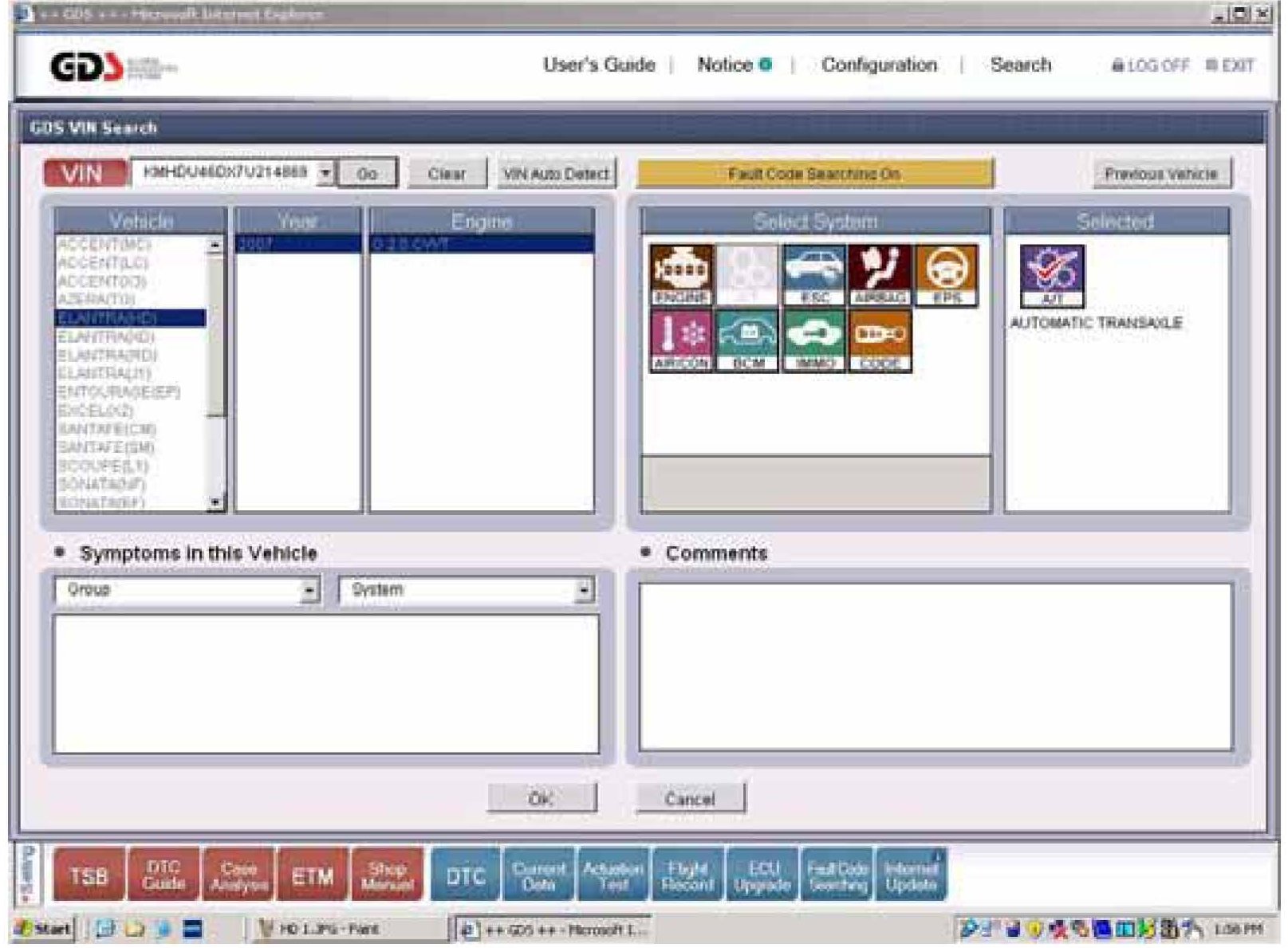 5. Press the VIN Auto Detect button to automatically read the vehicle's VIN (or you will need to manually enter vehicle, year, and engine if it does not automatically read this information) then press A/T (Automatic Transaxle) for system followed by the OK button at the bottom of the screen.