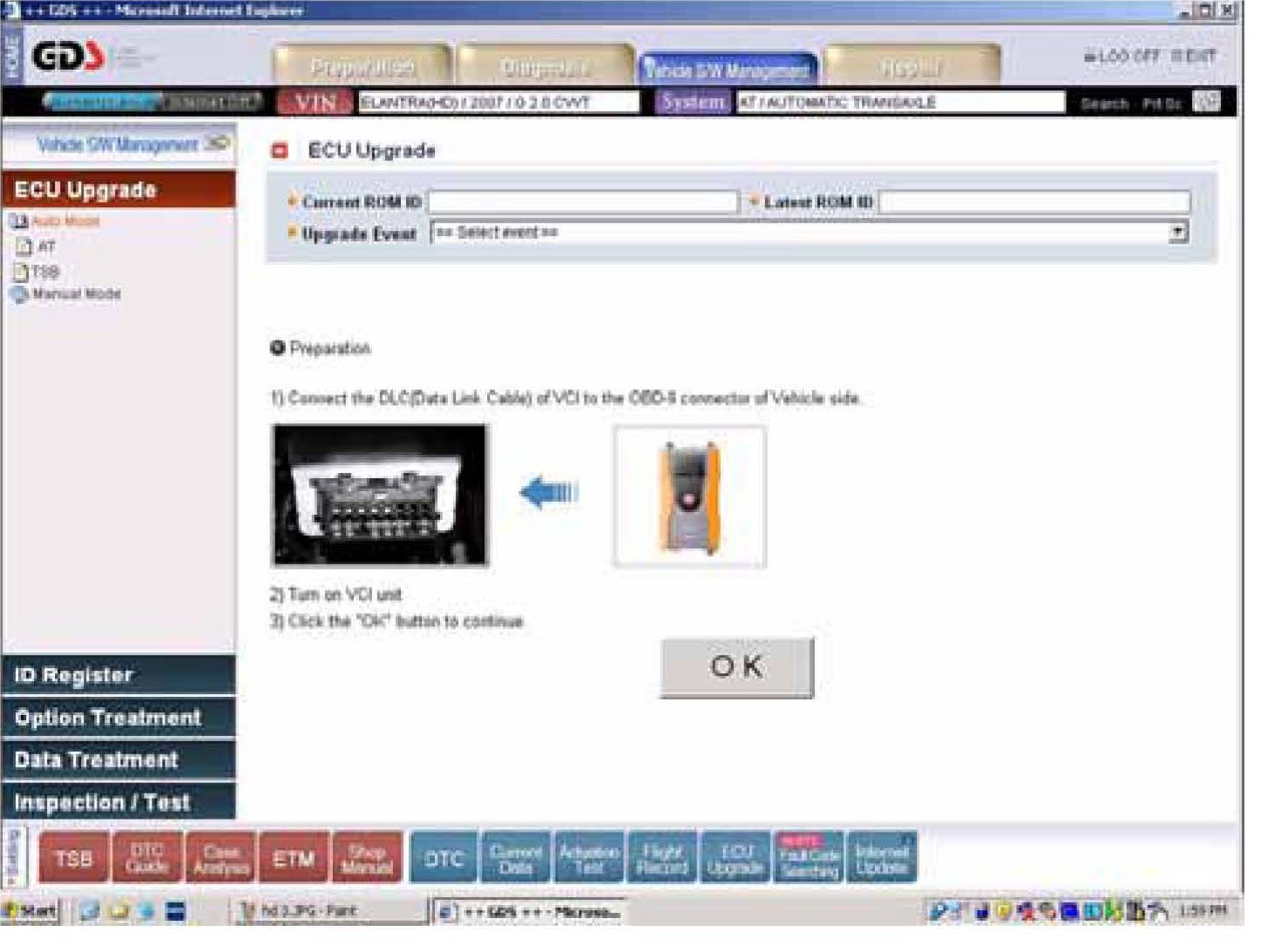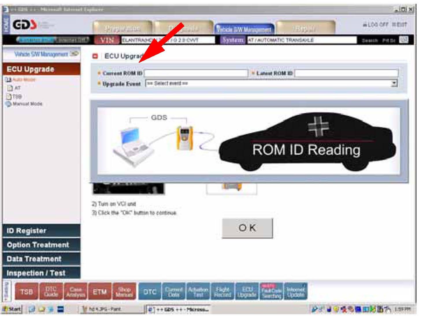7. In the left column of the following ECU Upgrade screen select Auto Mode followed by AT, then the OK button as shown.