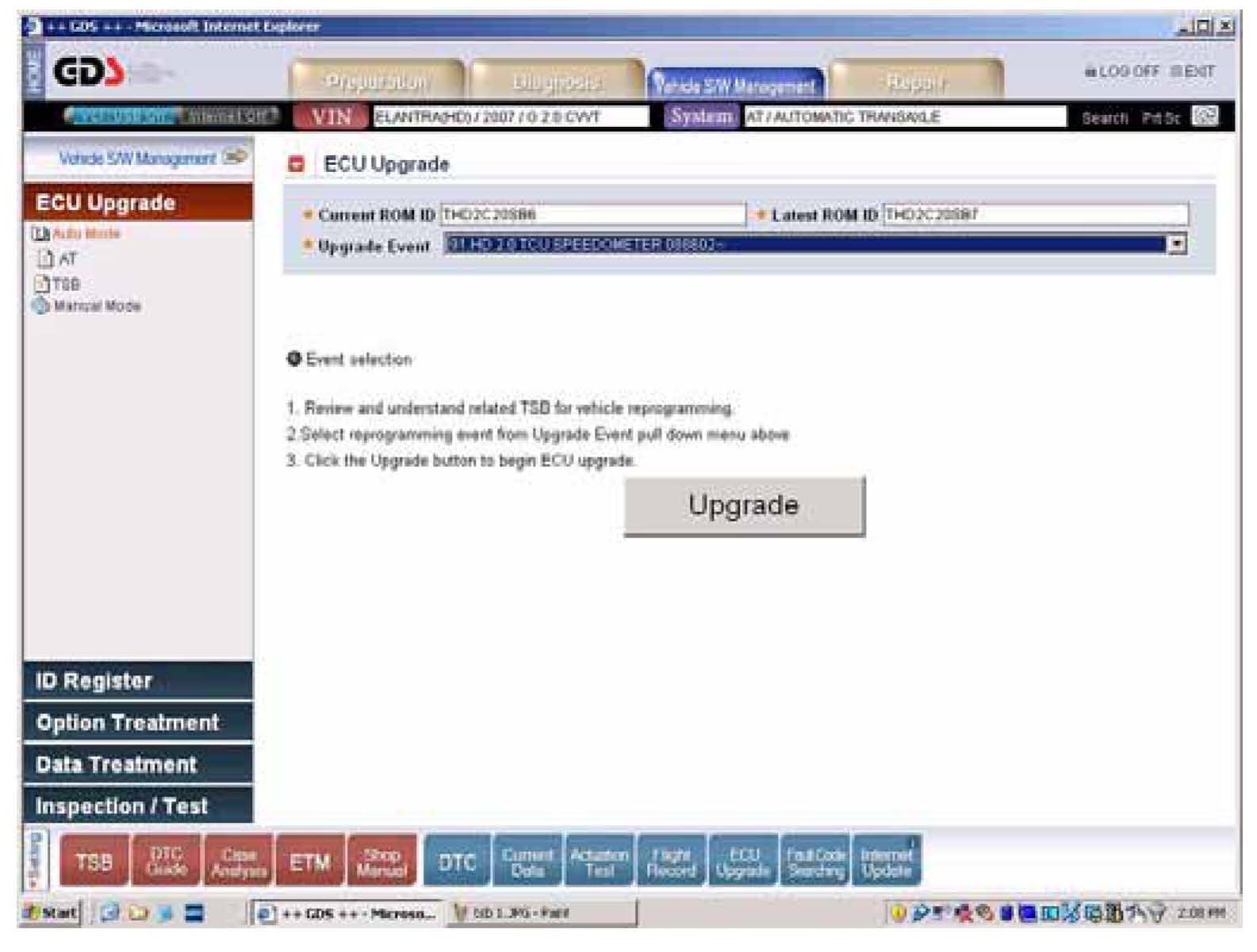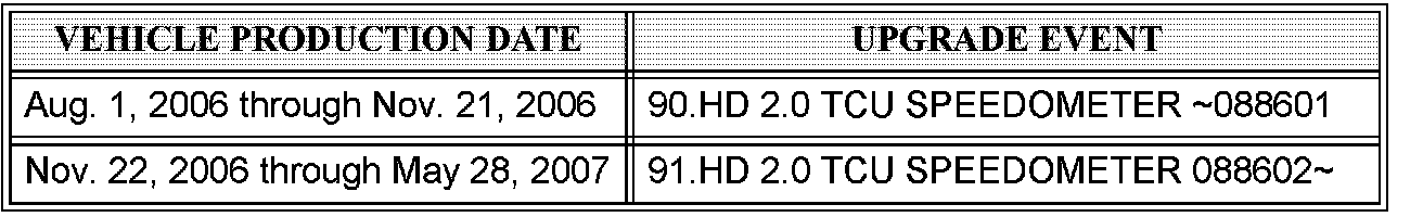 10. The screen will automatically display Upgrade Event 90.HD 2.0 TCU SPEEDOMETER - 088601 for vehicles produced from Aug. 1, 2006 through Nov. 21, 2006 OR 91.HD 2.0 TCU SPEEDOMETER 088602 - for vehicles produced from Nov. 22, 2006 through May 28, 2007. Select the appropriate event and press the UPGRADE button as shown in the screen.