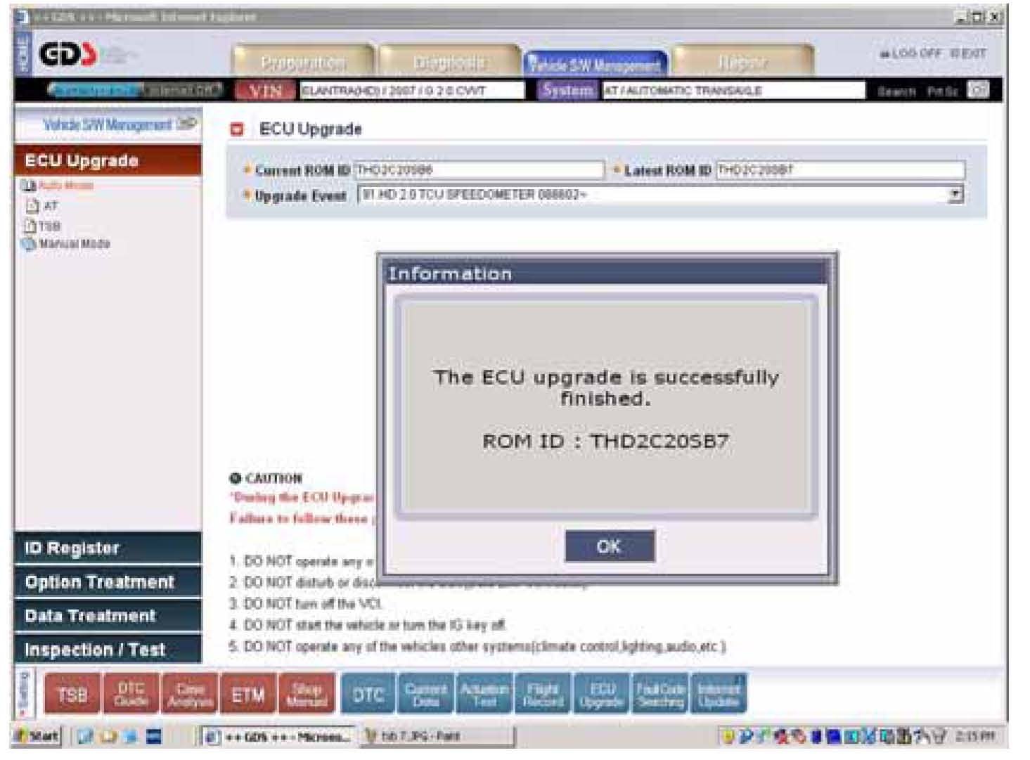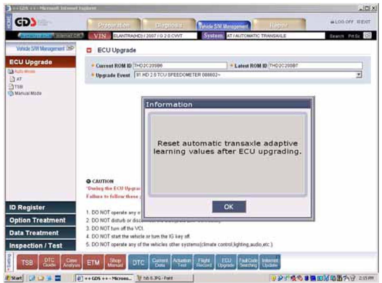 15. Click OK to reset the automatic transaxle adaptive learning values after updating the ECU.