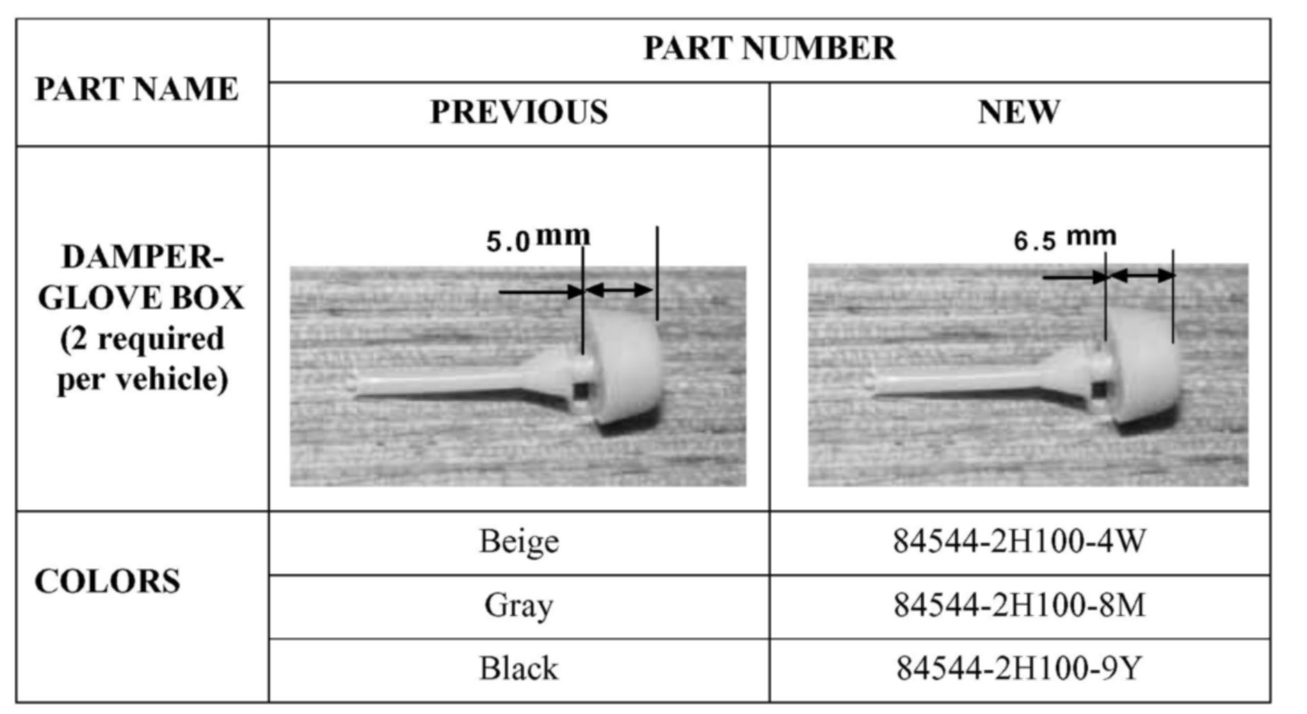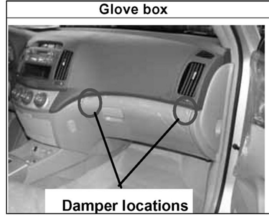 Some Elantra vehicles may have a rattle from the glovebox area when driven on rough pavement surfaces. This rattle can be prevented by replacing the dampers (bumpers) with revised dampers.
