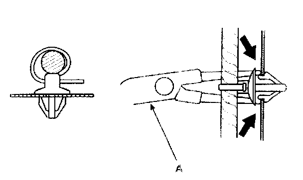 3. Slip pliers (A) under the clip base and through the hole at an angle, and then squeeze the expansion tabs to release the clip.