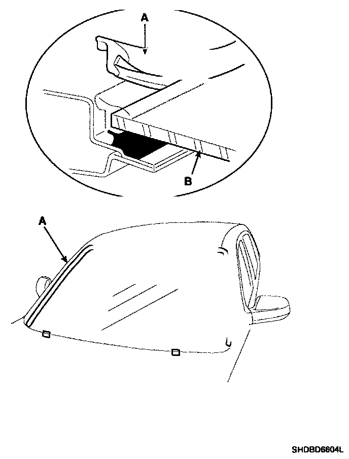 9. Pack adhesive into the cartridge without air pockets to ensure continuous delivery. Put the cartridge in a caulking gun, and run a bead of sealant (A) around the edge of the windshield (B) between the fastener and molding as shown. Apply the adhesive within 30 minutes after applying the glass primer. Make a slightly thicker bead at each corner.