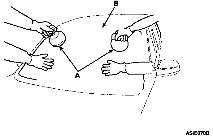 10. Use glass holder (A) to hold the windshield over the opening, align it with the alignment marks (B) made in step 15, and set it down on the adhesive. Lightly push on the windshield until its edges are fully seated on the adhesive all the way around. Do not open or close the doors until the adhesive is dry.