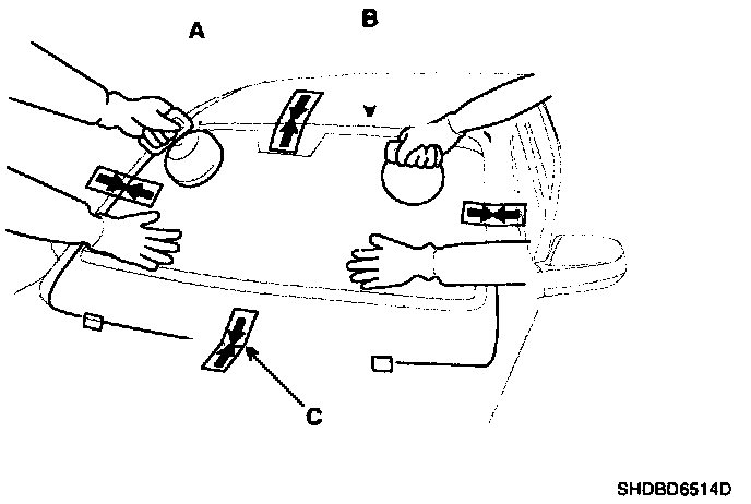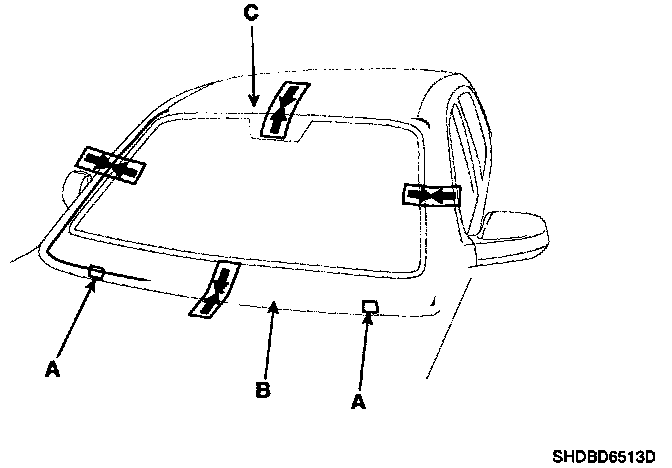 3. Apply the glass primer (A) to the side of the windshield glass edge and stick the both-sided adhesive tape (B) on the inside of molding (C).