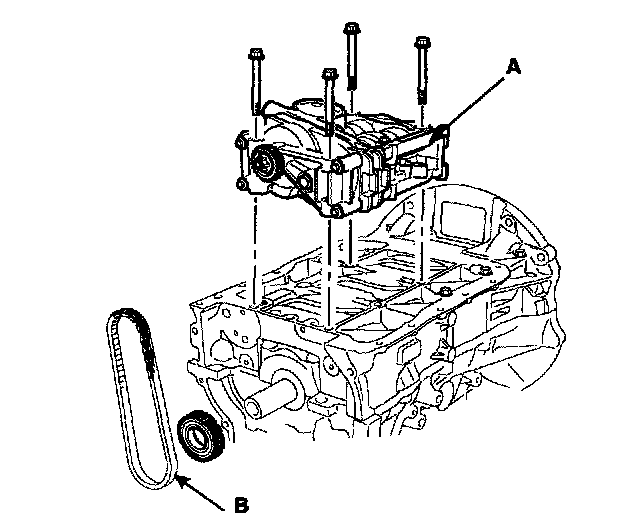 9. Remove the drive belt tensioner pulley and tensioner (B).