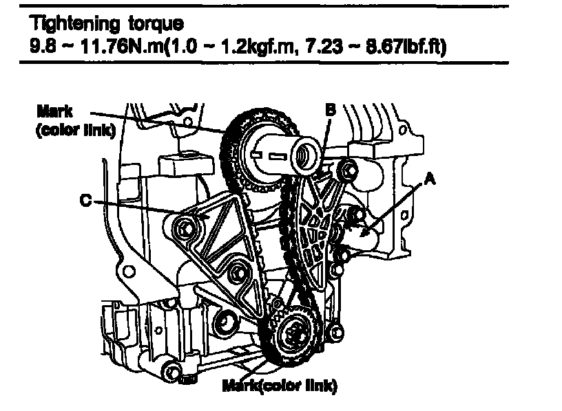 3. Install balance shaft module that the timing mark of balance shaft module sprocket should be matched with the timing mark (color link) of balance shaft chain.