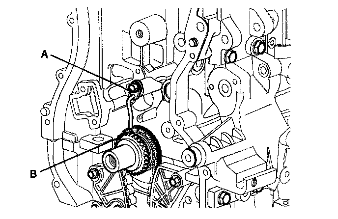 5. Install the balance shaft tensioner arm (B).