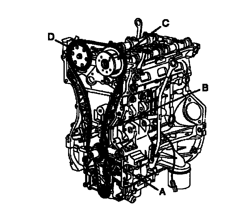 To install the timing chain with no slack between each shaft (cam, crank), follow this procedure. Crankshaft sprocket (A) -> Timing chain guide (B) Intake camshaft sprocket (C) -> Exhaust camshaft sprocket (D).