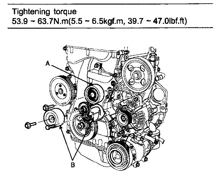 20. Install drive belt tensioner (B) and tensioner pulley.