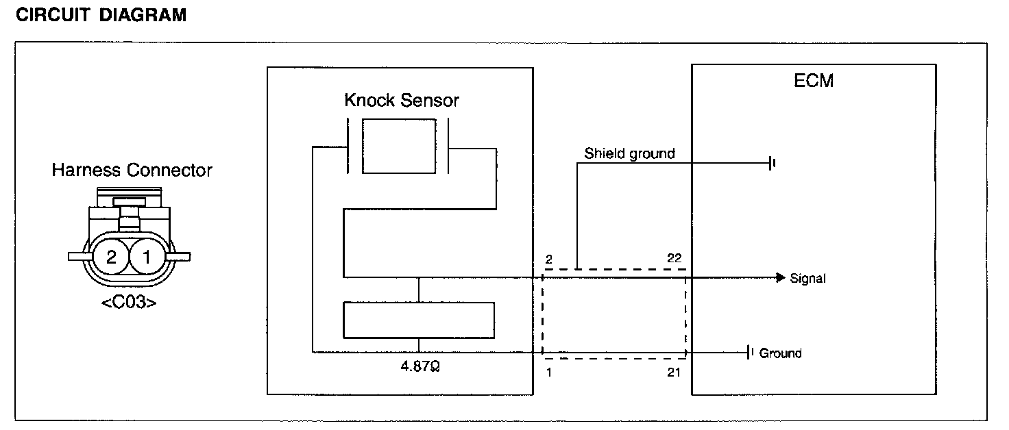 The Knock Sensor is attached to the cylinder block and senses engine knocking. The sensor contains a piezoelectric element that converts vibration (or noise) into voltage signal and sends this signal to ECM. ECM uses this signal to suppress knocking by retarding ignition timing.