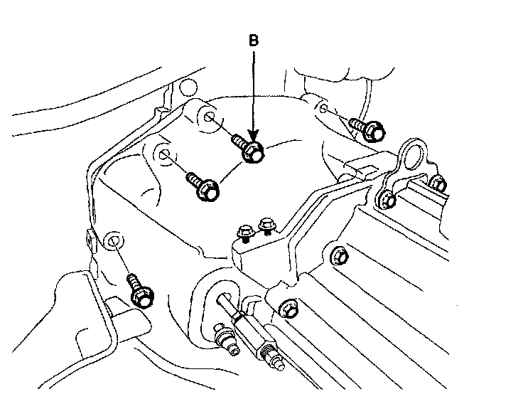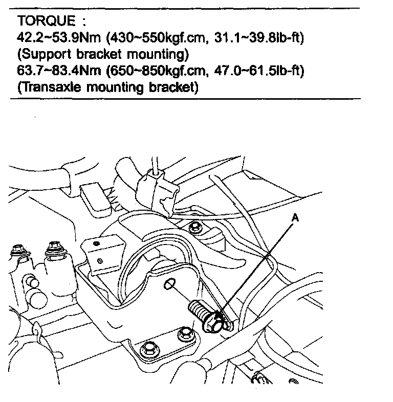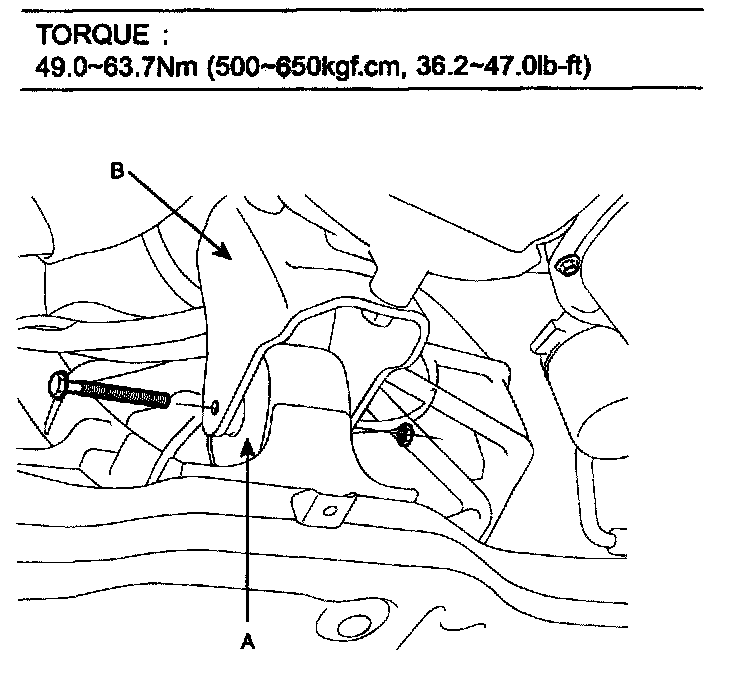 1. Raising the jack slowly, tighten the transaxle mounting bolts (A) and support bracket mounting bolts (B).