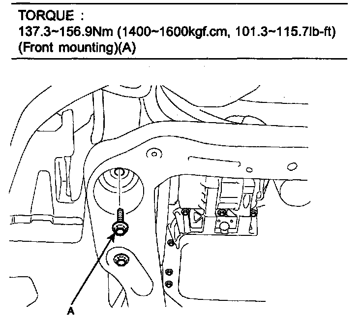 TORQUE: 137.3 - 156.9 Nm (1400 - 1600 kgf-cm, 101.3 - 115.7 ft. lbs.) (Front mounting) (A)
