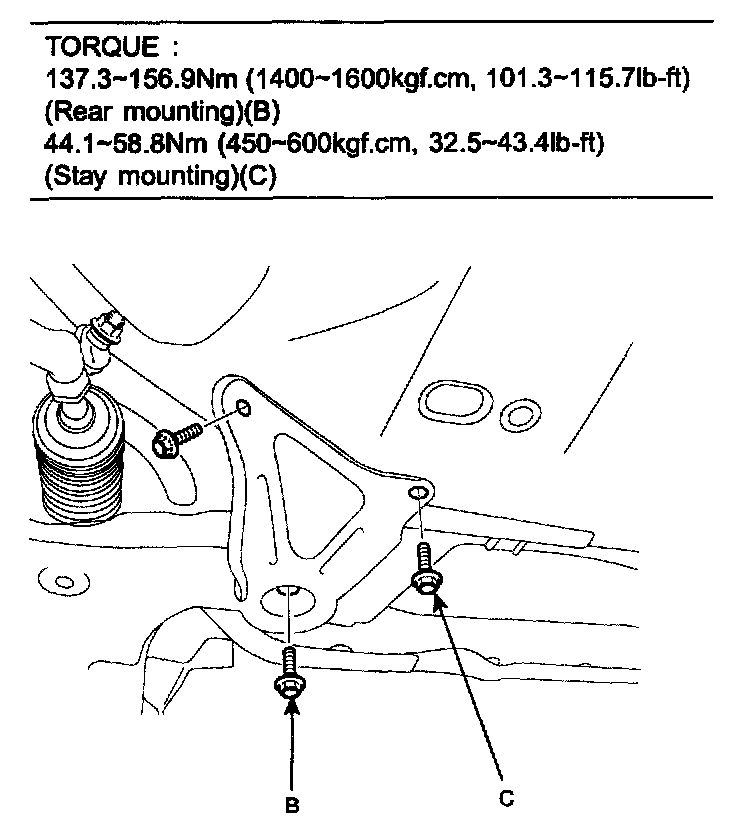 TORQUE: 137.3 - 156.9 Nm (1400 - 1600 kgf-cm, 101.3 - 115.7 ft. lbs.) (Rear mounting) (B)