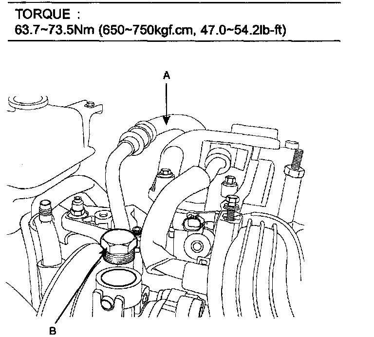 16. After tightening the power steering pressure hose (A) bolt (B), fill the power steering fluid.