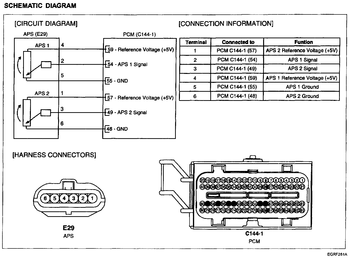 Accelerator Position Sensor (APS) is installed on the accelerator pedal module and detects the rotation angle of the accelerator pedal. The APS is one of the most important sensors in engine control system, so it consists of the two sensors which adapt individual sensor power and ground line. The second sensor monitors the first sensor and its output voltage is half of the first one. If the ratio of the sensor 1 and 2 is out of the range (approximately 1/2), the diagnostic system judges that it is abnormal.