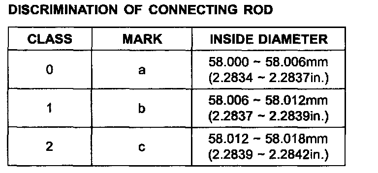 Big end inner diameter 58.000 - 58.018 mm (2.2834 - 2.2842 inch)