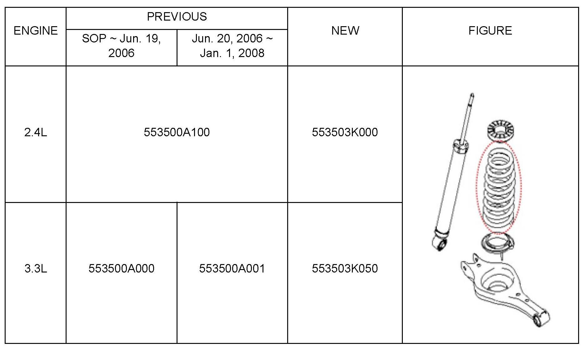 This bulletin provides information on coil spring service parts for 2006-2008 model year Sonata vehicles. Refer to the table for the updated part numbers.