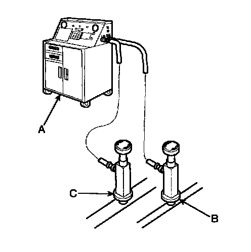 Recovery/Recycling/Charging System (A) to the high-pressure service port (B) and the low-pressure service port (C) as shown, following the equipment manufacturer's instructions.