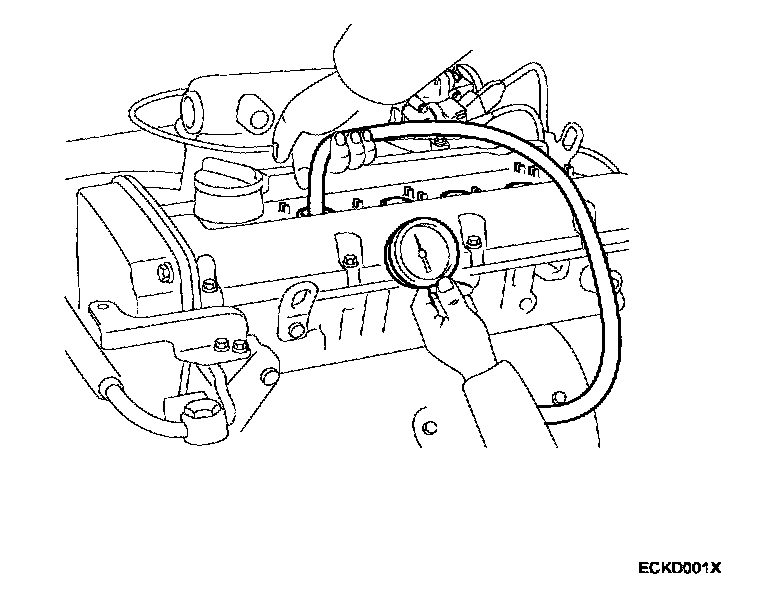 5) If the cylinder compression in 1 or more cylinders is low, pour a small amount of engine oil into the cylinder through the spark plug hole and repeat steps (l) through (3) for cylinders with low compression.