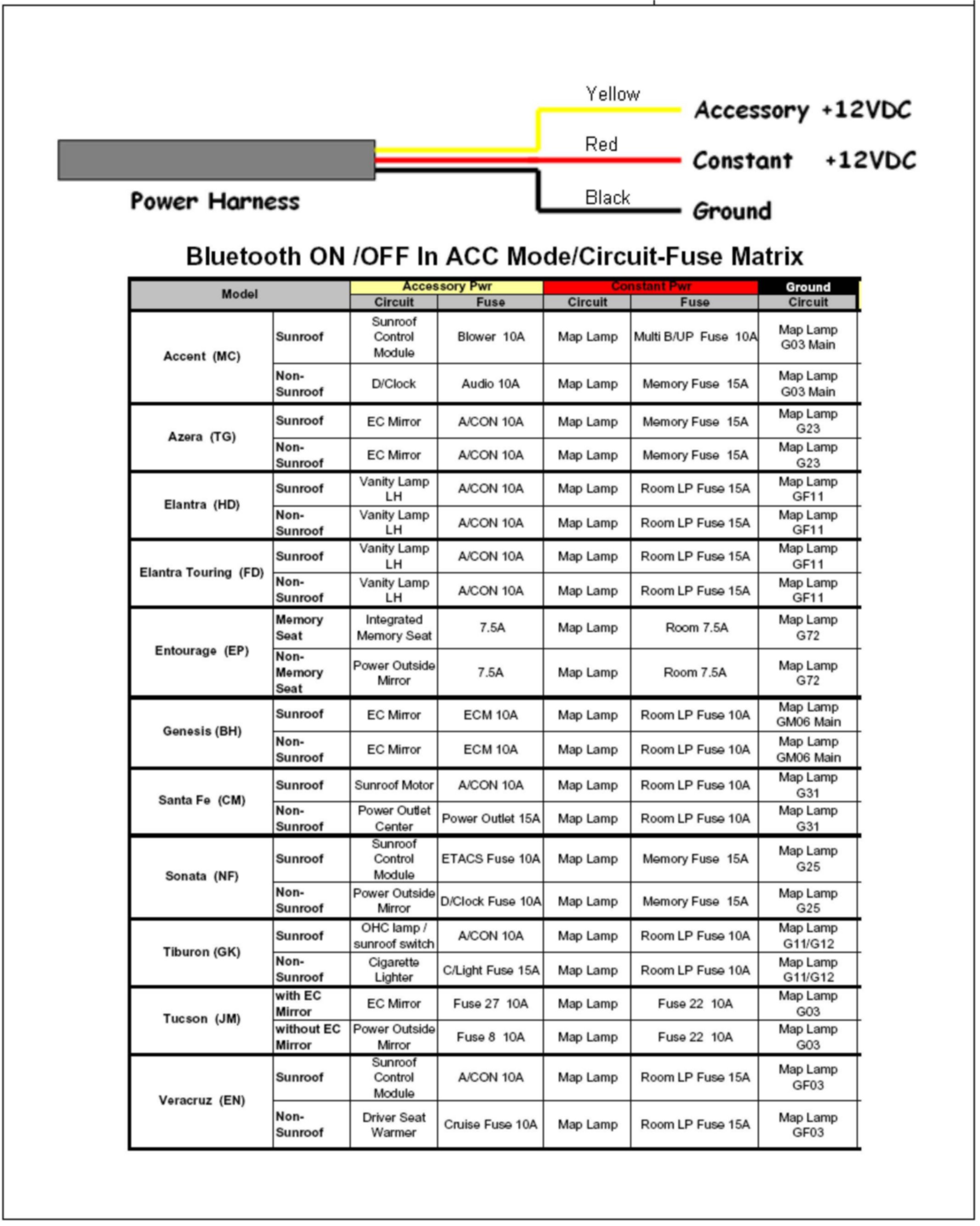 4. Refer to the power harness diagram and circuit-fuse matrix (shown above) to check the BATT, ACC, and GND circuits.