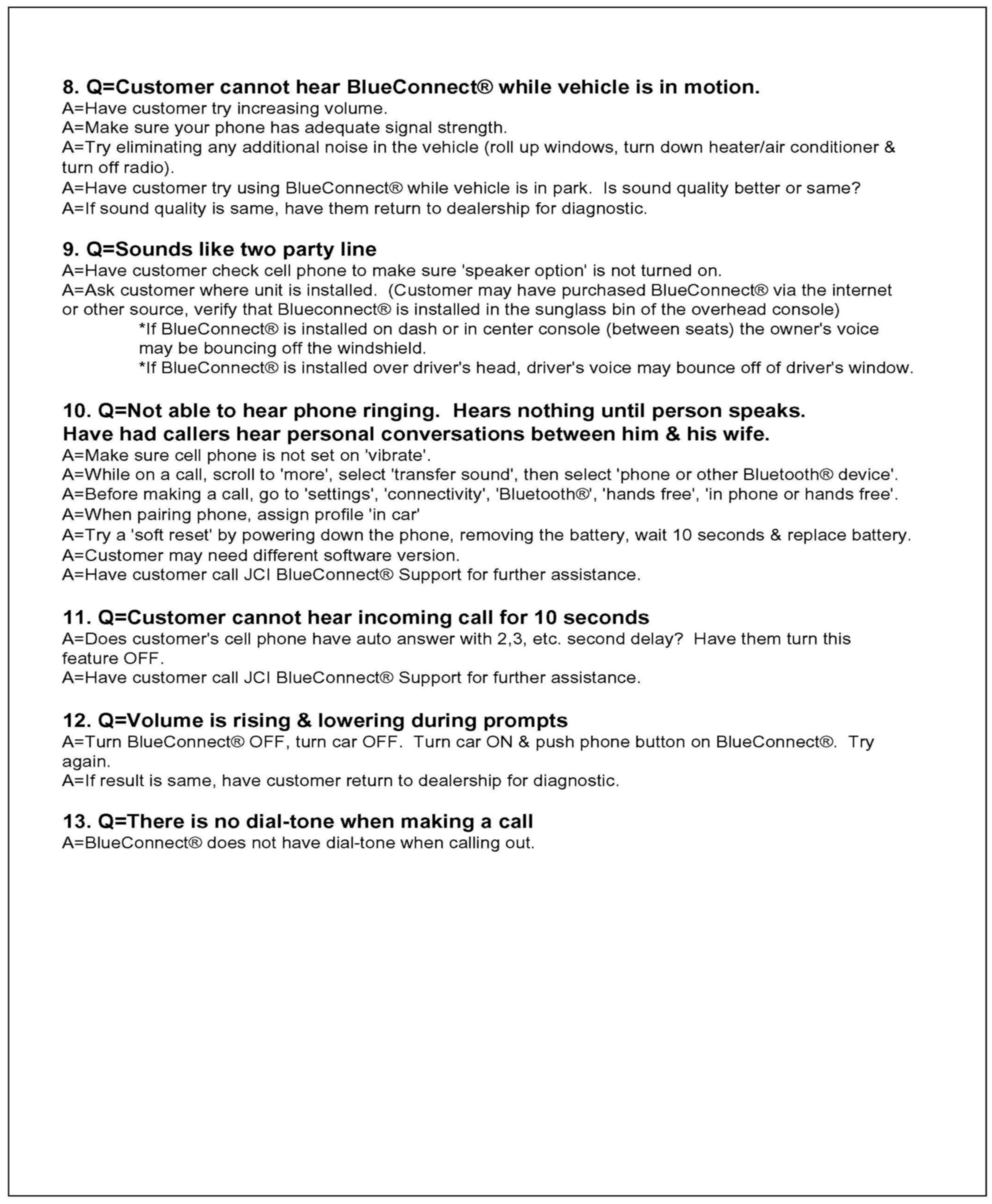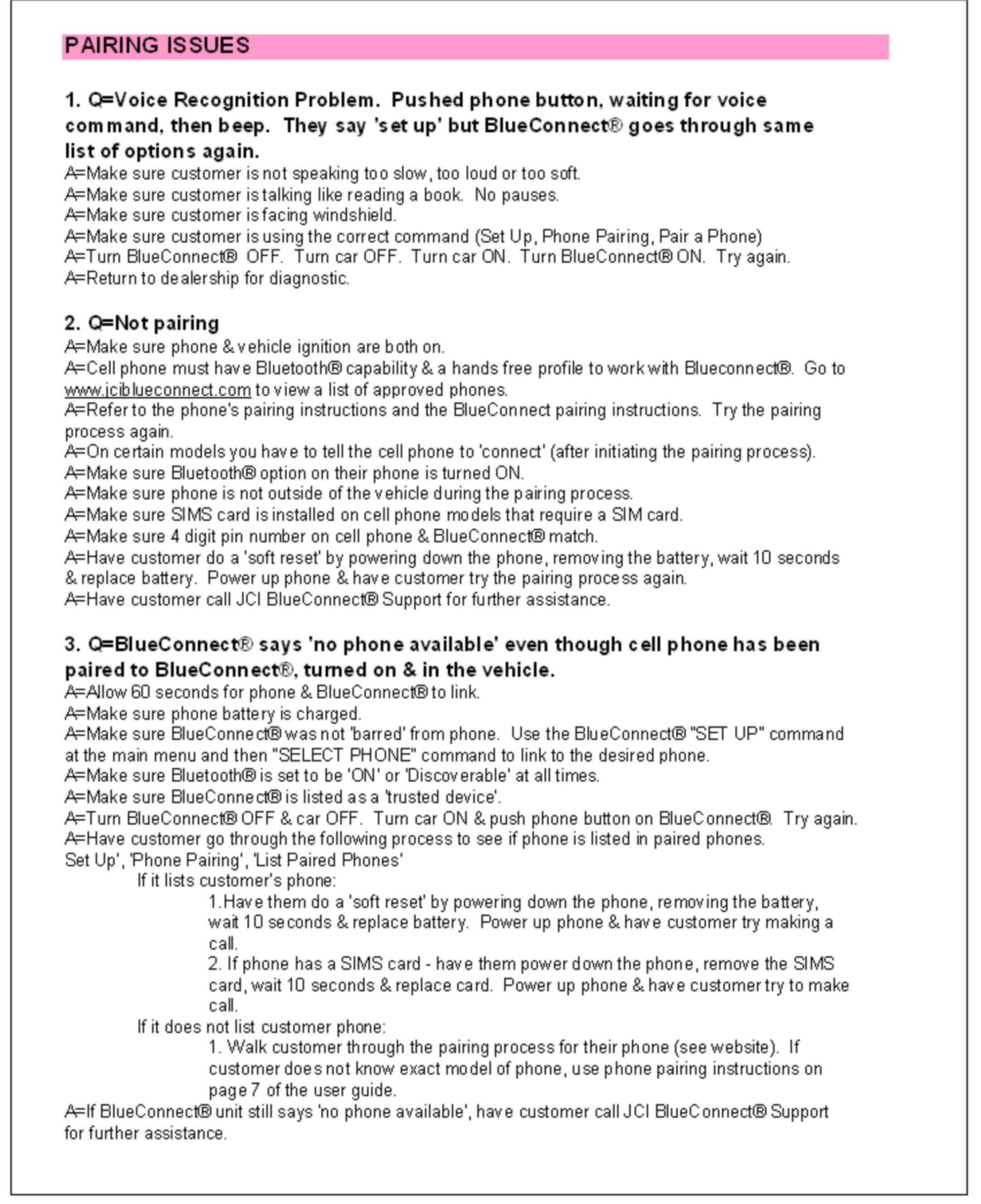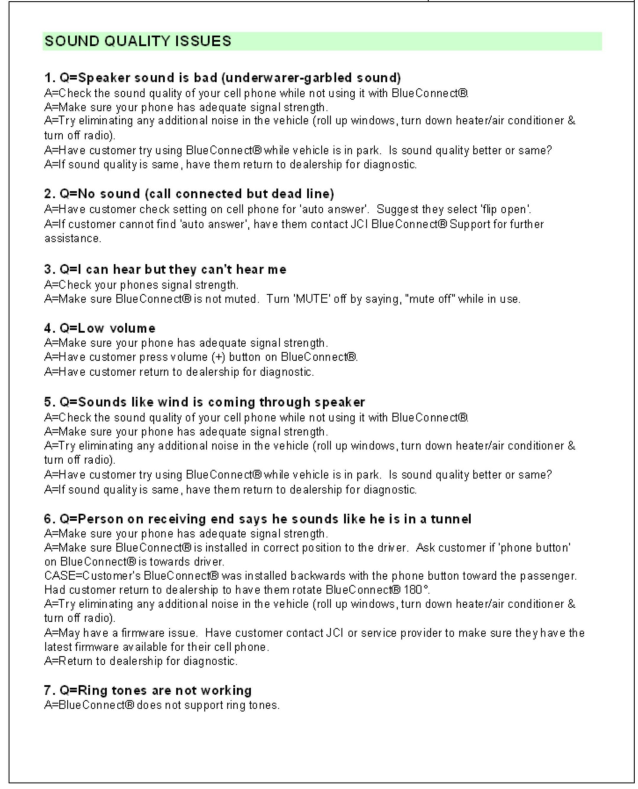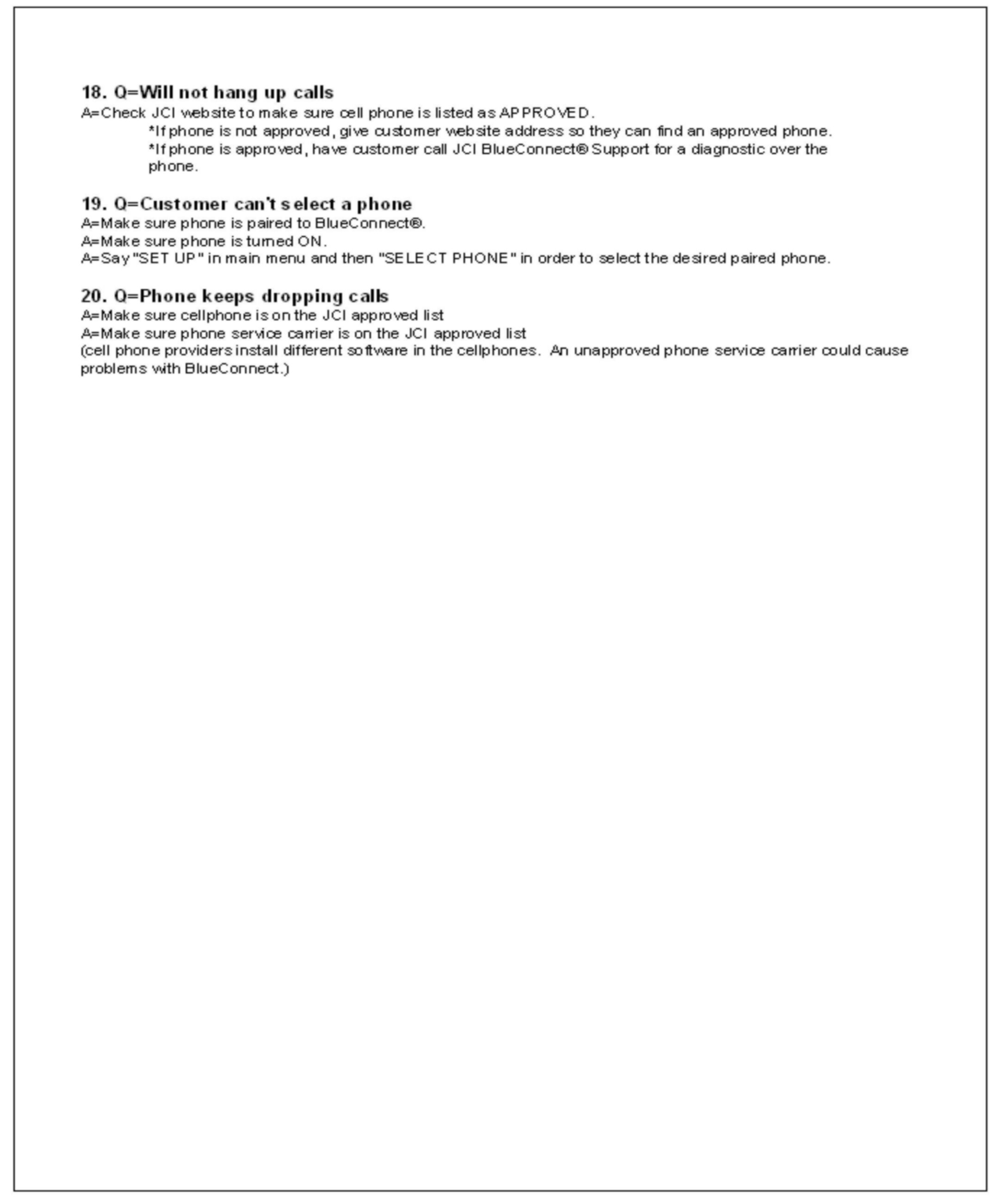 1. Consult the customer and obtain the exact nature of the problem (e.g. completely inoperative, sound quality is poor, etc.) and the make & model of their cellular phone.2. Check phone compatibility at www.jciblueconnect.com or by calling 1-888-528-7930. If the phone is not listed as compatible, advise the customer that their phone is not compatible.