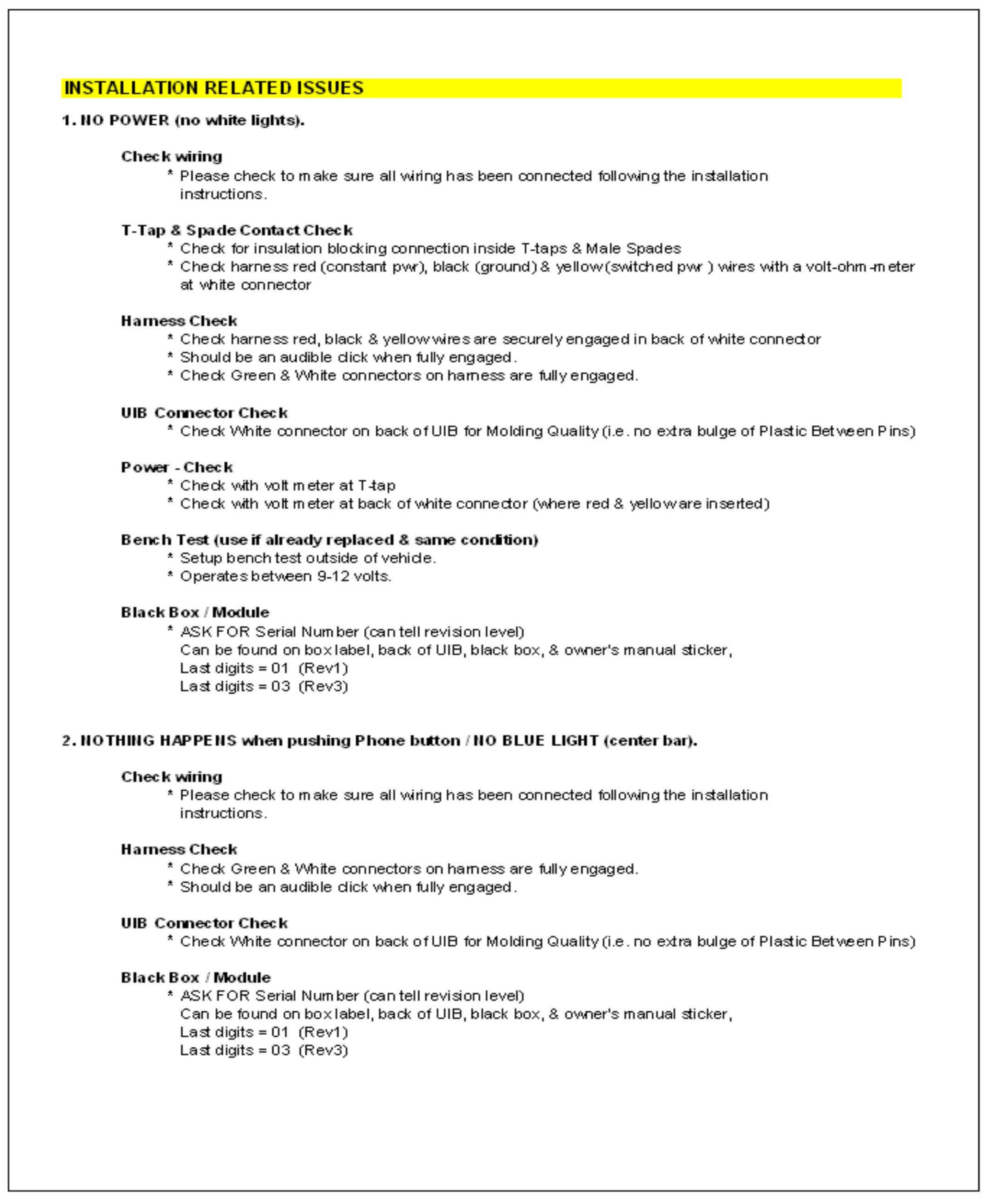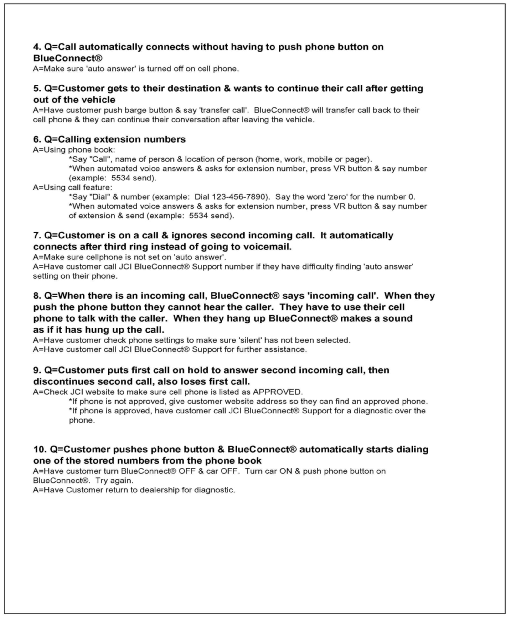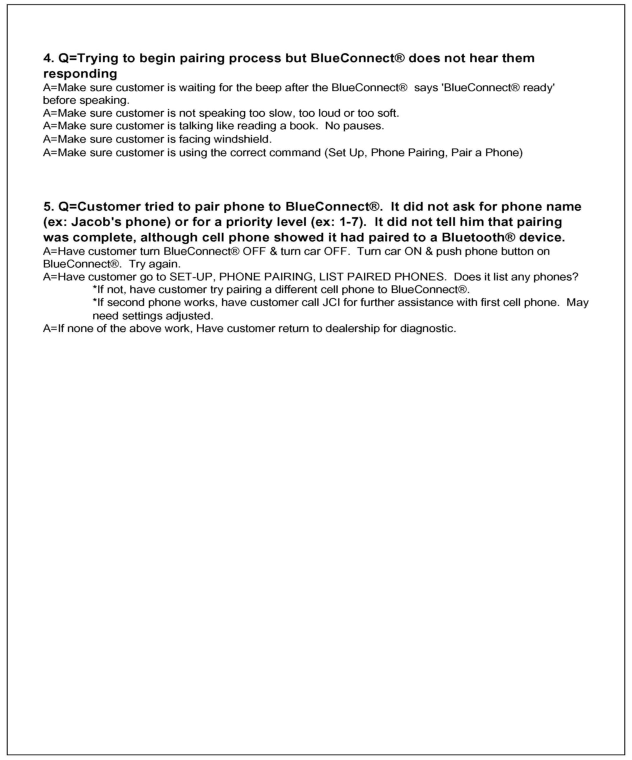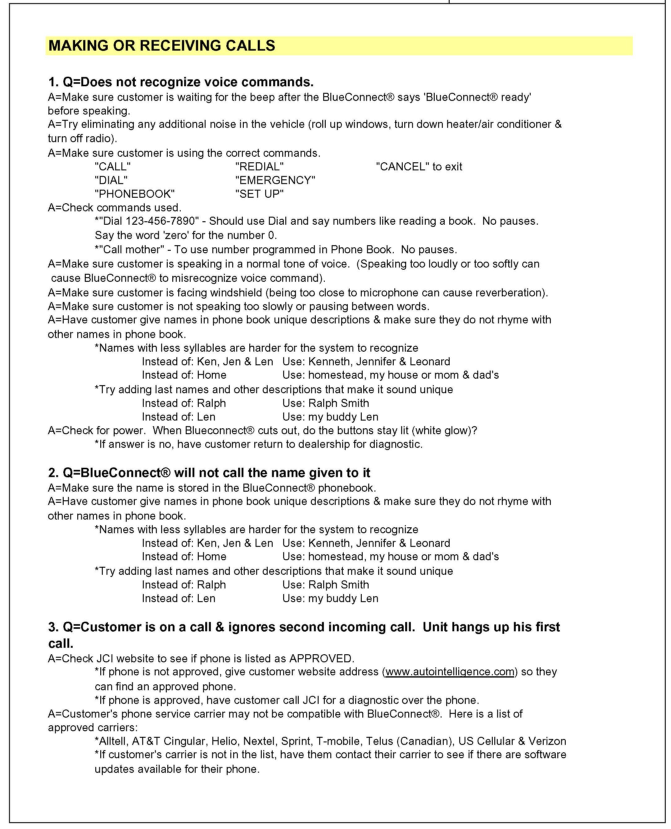 1. Consult the customer and obtain the exact nature of the problem (e.g. completely inoperative, sound quality is poor, etc.) and the make & model of their cellular phone.2. Check phone compatibility at www.jciblueconnect.com or by calling 1-888-528-7930. If the phone is not listed as compatible, advise the customer that their phone is not compatible.