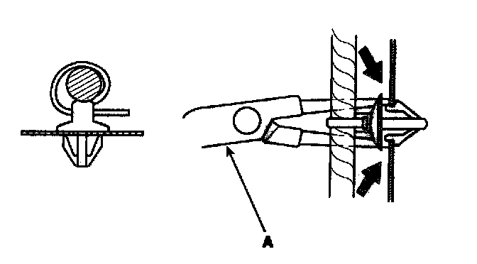 3. Slip pliers (A) under the clip base and through the hole at an angle, then squeeze the expansion tabs to release the clip.