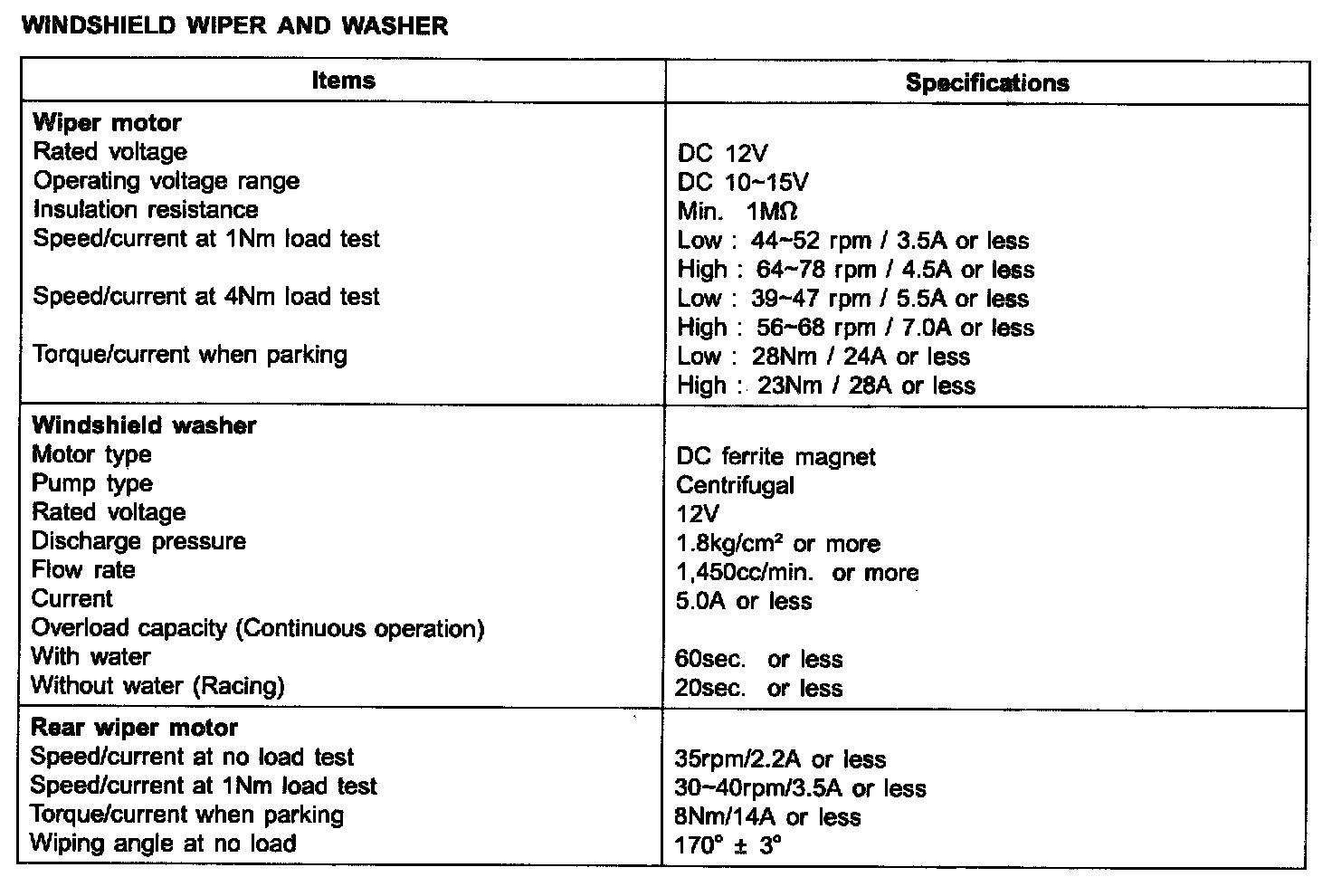 Wiper and Washer Systems: Specifications
