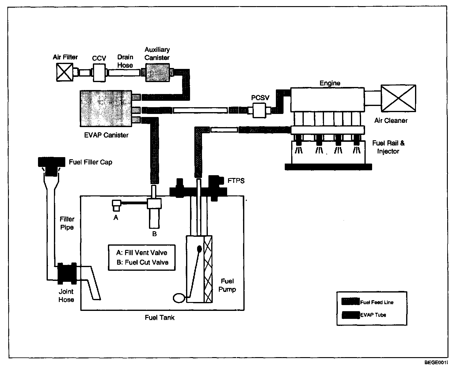 Evaporative Emission Control System prevents fuel vapor stored in fuel tank from draining into the atmosphere. When the fuel evaporates in the fuel tank, the vapor passes through vent hoses or tubes to EVAP. canister filled with charcoal and the EVAP. canister temporarily holds it with charcoal. If ECM wants to draw the gathered vapor into the combustion chambers during certain operating conditions, it will make vacuum in intake manifold to move it.