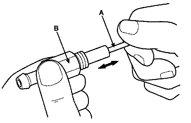 2. Insert a thin stick(A) into the PCV valve(B) from the threaded side to check that the plunger moves.