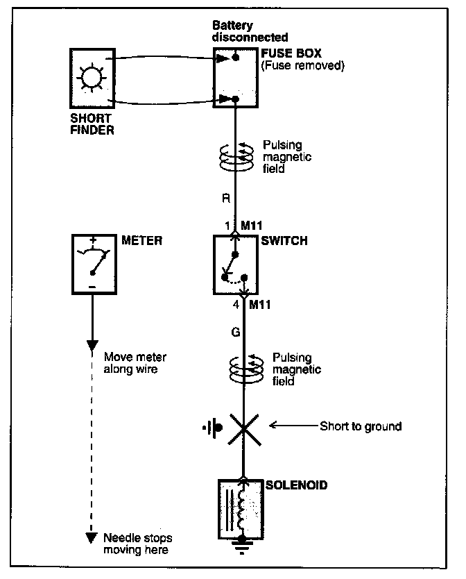 E. Beginning at the fuse box, slowly move the short finder along the circuit wiring. The meter will show current pulses through sheet metal and body trim. As long as the meter is between the fuse and the short, the needle will move with each current pulse. Once the meter is moved past the point of the short, the needle will stop moving. Check around this area to locate the cause of the short circuit.
