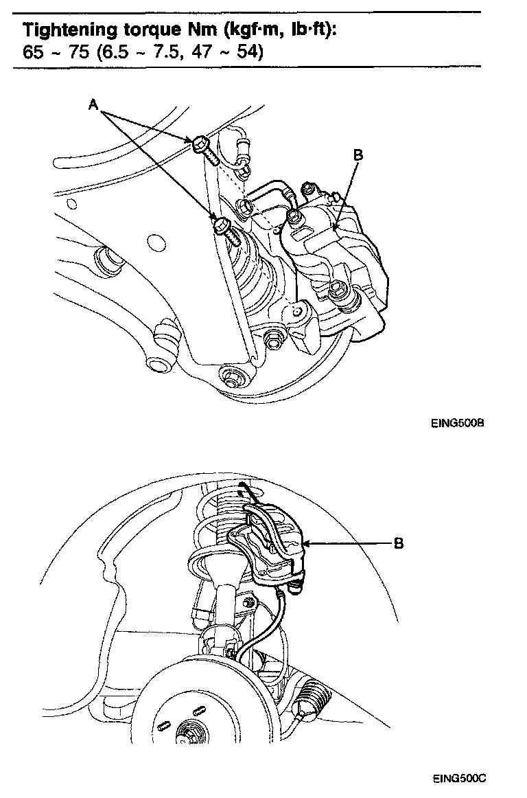 2. Remove the caliper assembly (A) from knuckle (B) and suspend it with wire.