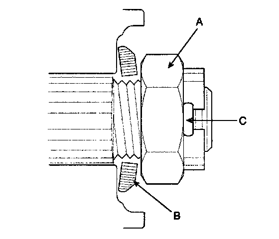 CAUTION: The washer (B) should be assembled with convex surface outward when installing the castle (A) nut and split pin (C).