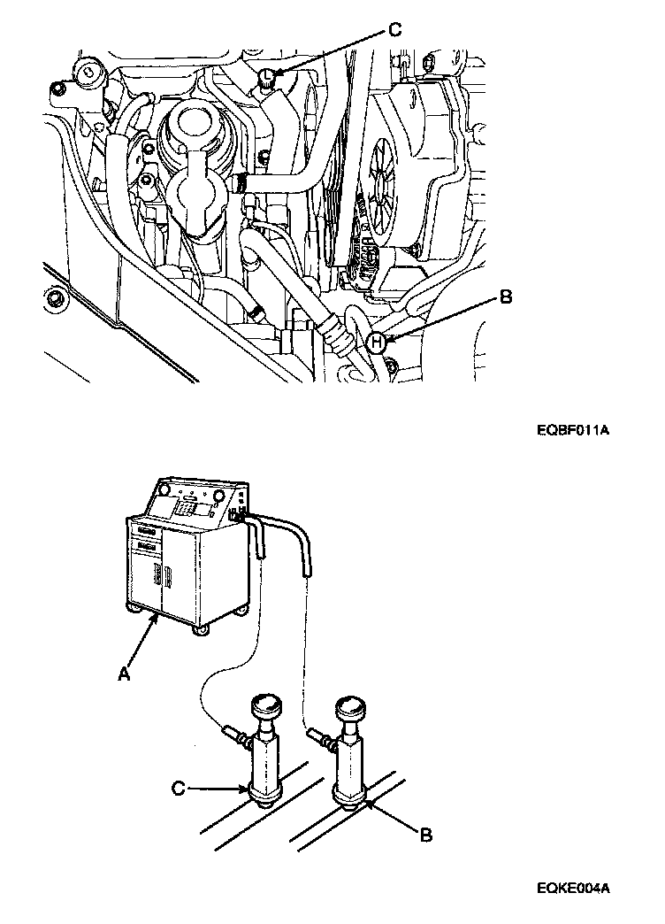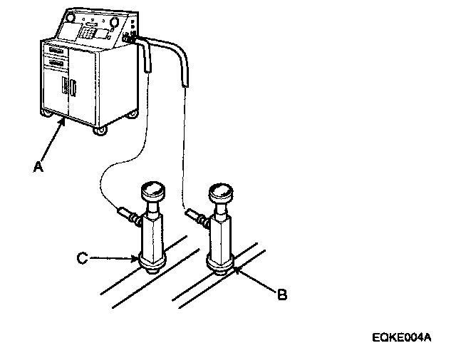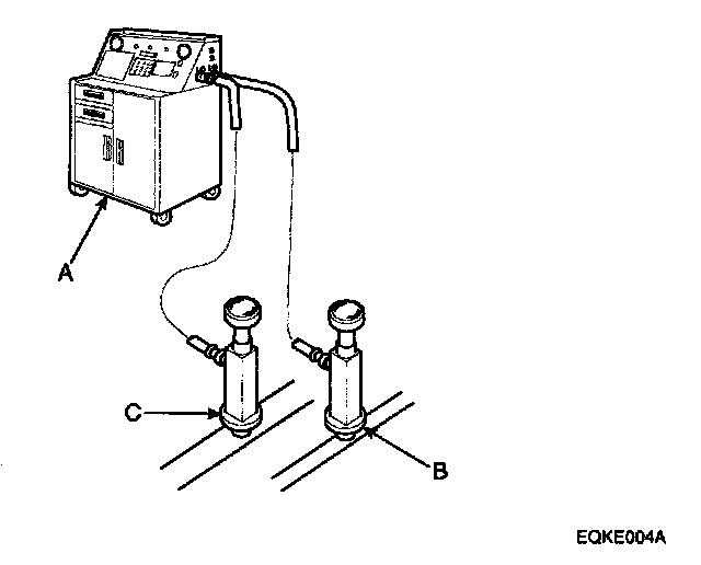 1. Connect an R-134a refrigerant Recovery/Recycling/Charging System (A) to the high-pressure service port (B) and the low-pressure service port (C) as shown, following the equipment manufacturer's instructions.