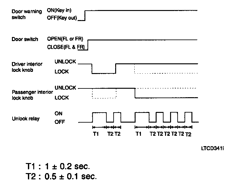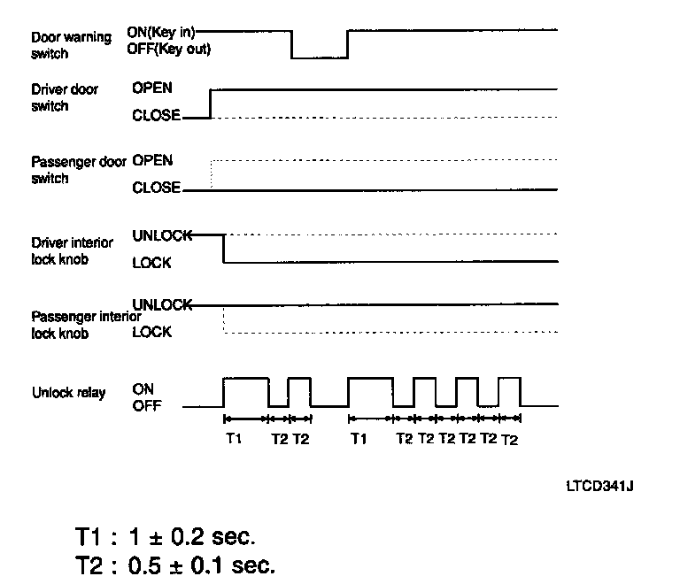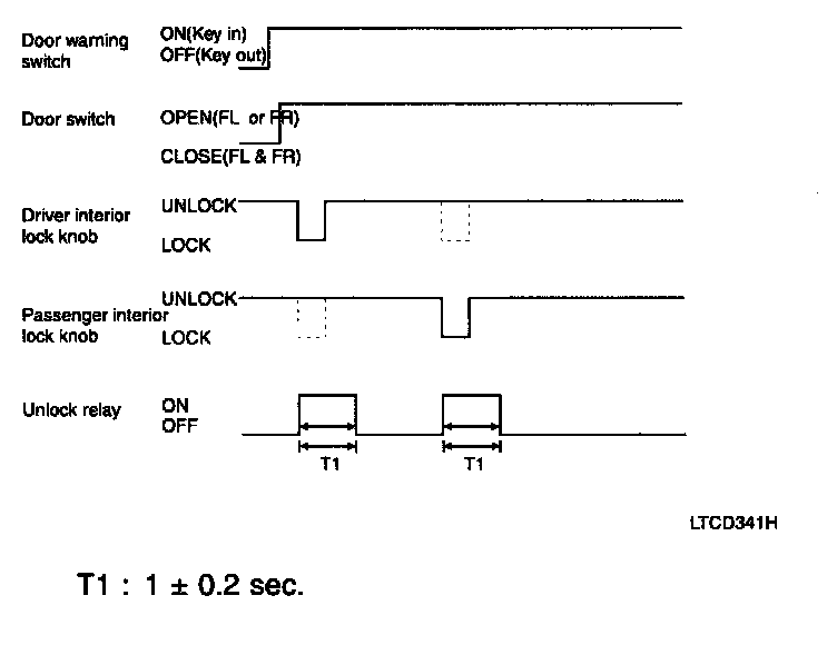 1. If the door switch of driver side or passenger side is locked when door warning switch is turned on and (CAN communication reception), driver side or passenger side door is open, it executes unlock output for 1 second. If the passenger side door remains locked even after the unlock output, it repeats on and off 3 times with the time interval of 0.5 second.