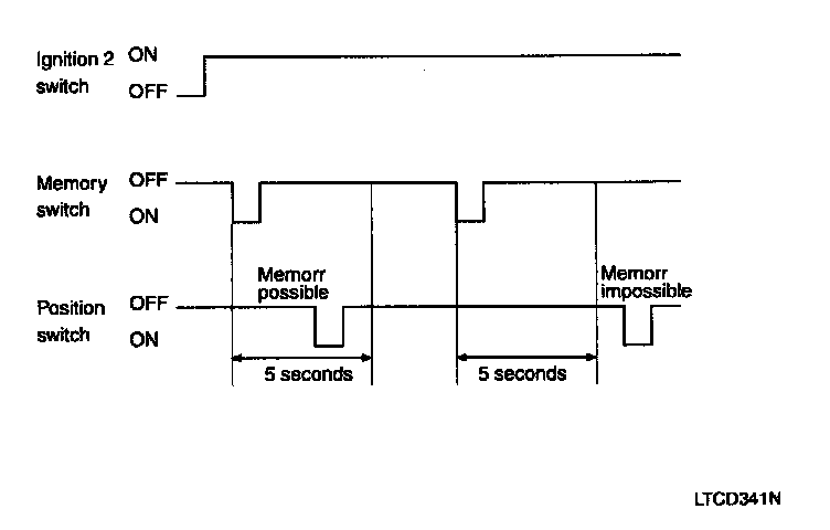 1. If position switch (POS1 or POS2) is pressed within 5 seconds after pressing the memory switch under ignition 2 on, it registers current mirror position. (Switch module sends in LIN communication). (Memory permit status lasts for 5 seconds after memory switch ON. After 5 seconds, memory permits status terminates. In other words, current position is registered if the position switch (POS1 or POS2) is turned on, during the memory permit status). However, RH side mirror position is not registered during the LH side mirror manual switch operation.