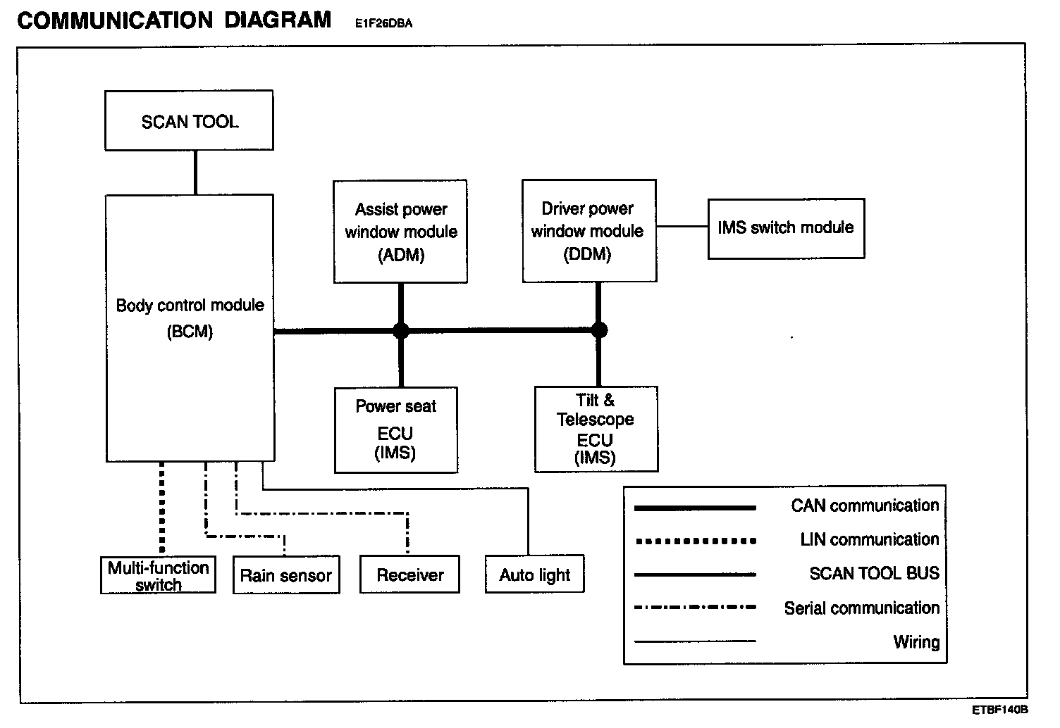 Driver side power window switch, a component of CAN, performs CAN communication with BCM, seat ECU, tilt ECU, passenger side power window switch. Driver controls driver side power window switch button located inside of the driver side door to operate power window, mirror, door lock and unlock.