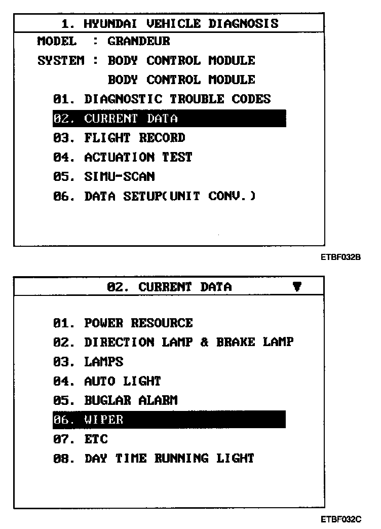 4. Select "Current data" and wiper.