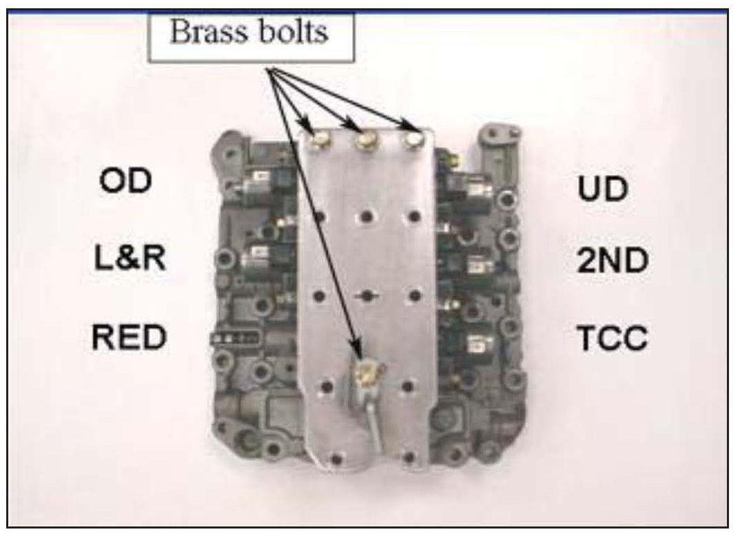 12. Remove all the valve body bolts except the four brass bolts shown.