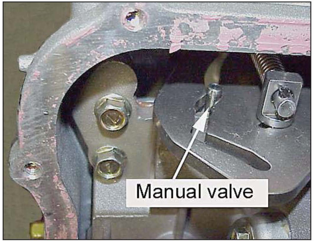 14. Carefully align the manual valve on the valve body to the manual control shaft and reinstall the valve body.