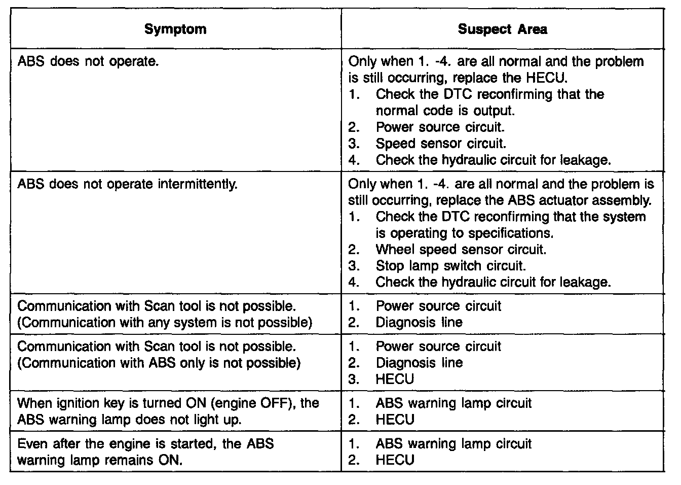 PROBLEM SYMPTOMS TABLEIf a normal code is displayed during the DTC check but the problem still occurs, check the circuits for each problem symptom in the order given in the table below and proceed to the relevant troubleshooting page.