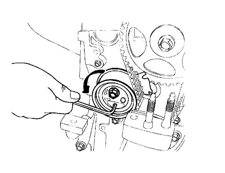 NOTE: When check the timing belt tension or install the timing belt tensioner, must it the engine oil temperature is between 15°C (59°F) and 25°C (77°F).