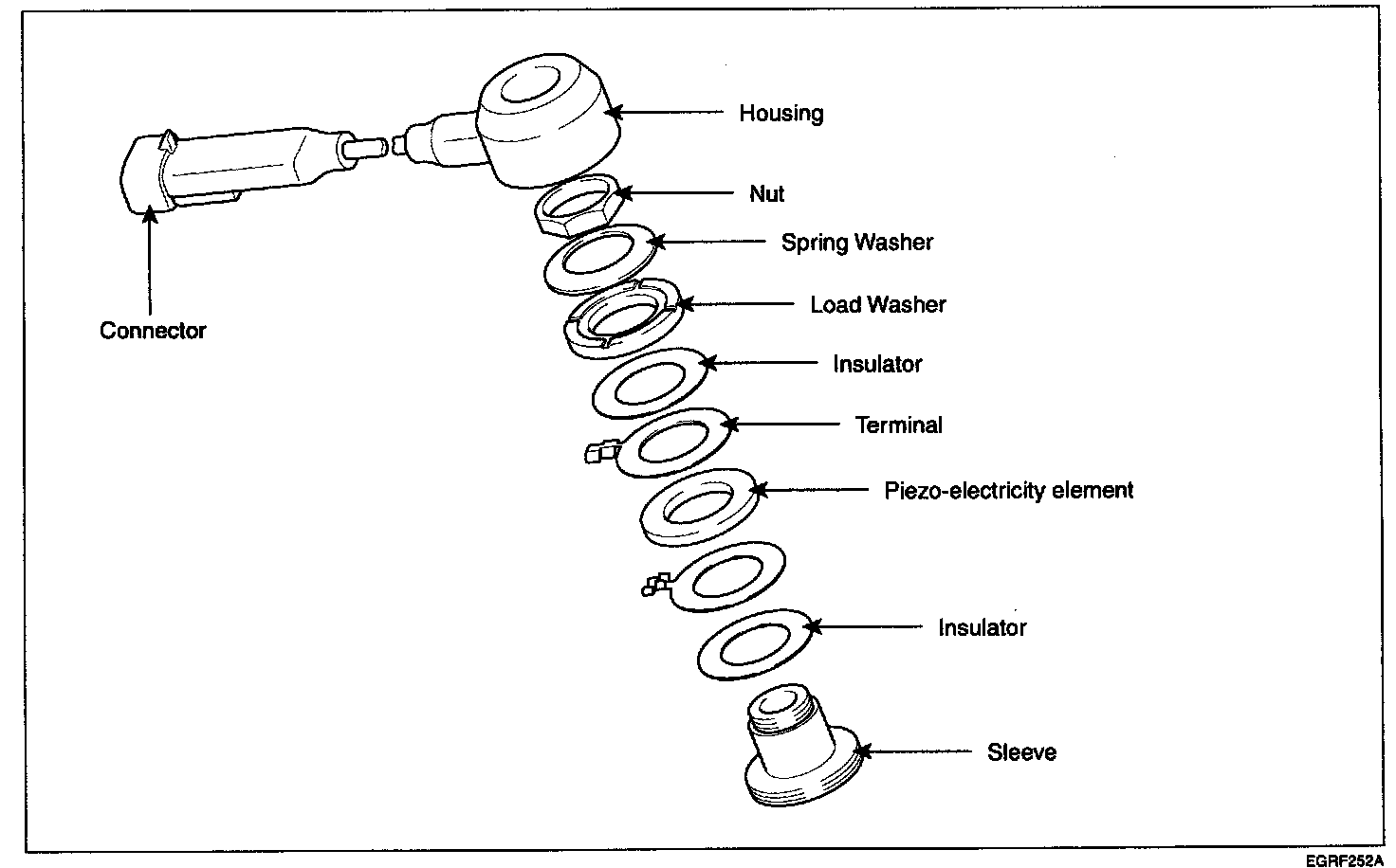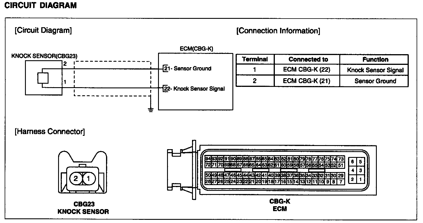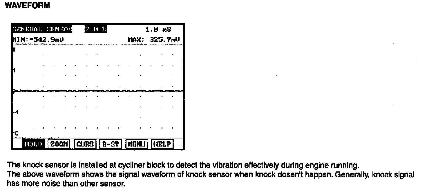 Knocking is a phenomenon characterized by undesirable vibration and noise and can cause engine damage. Knock Sensor (KS) senses engine knocking and the cylinder block. When knocking occurs, the vibration from the cylinder block is applied as pressure to the piezoelectric element. At this time, this sensor transfers the voltage signal higher than the specified value to the ECM and the ECM retards the ignition timing. If the knocking disappears after retarding the ignition timing, the ECM will advance the ignition timing. This sequential control can improve engine power, torque and fuel economy.